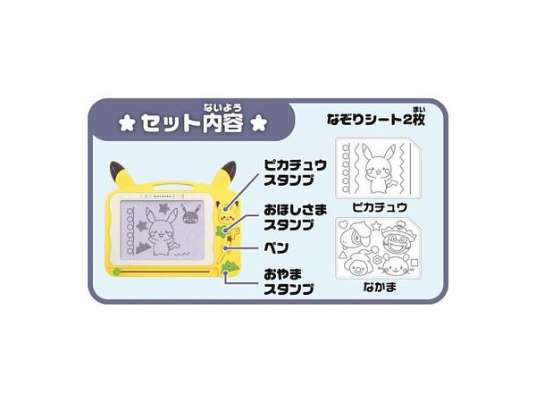 マグネットスタンプ3つ<ピカチュウ、おやま、おほしさま>と、なぞりシート2枚<キャラクター、いろいろな線>が付属。