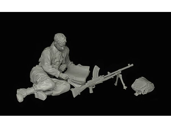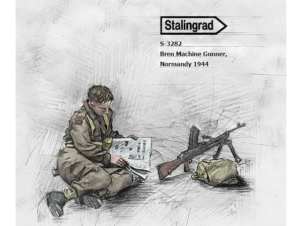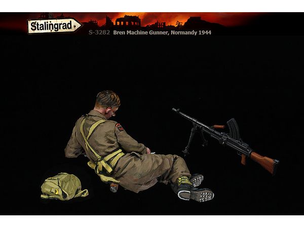 無帽でP37バトルドレス、アンクルブーツを着用した姿で、二脚を立てて置いたブレン軽機関銃、身に付けたままのアンモポーチ、傍らに置かれたハバーザックなどの装備も精密に再現します。