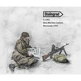 左向きに横たわり、ヘルメットや装備を取って新聞を広げて読むブレン軽機関銃手の歩兵をモデル化しています。