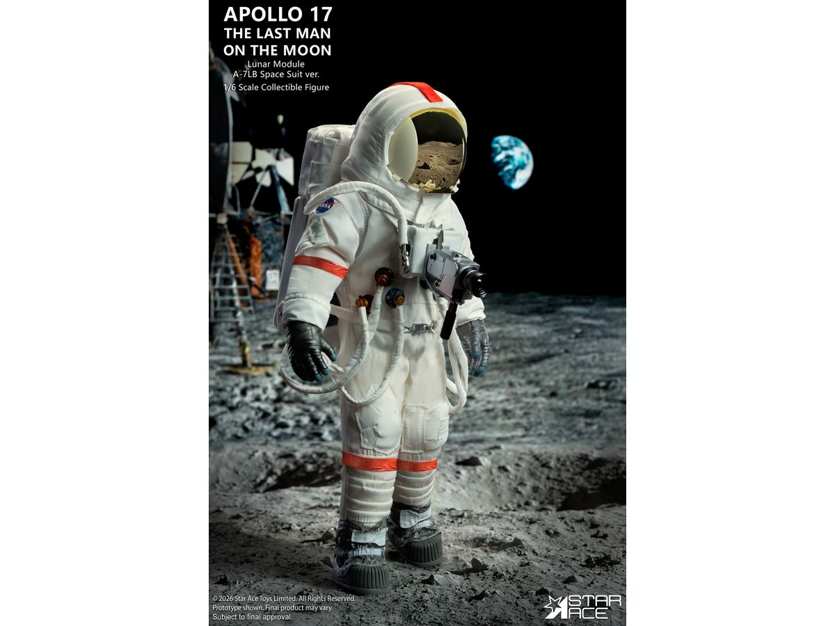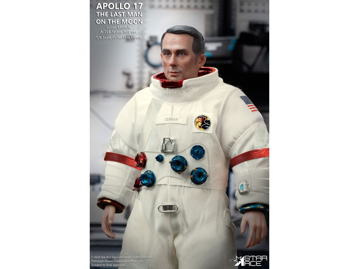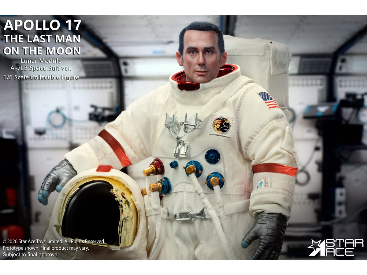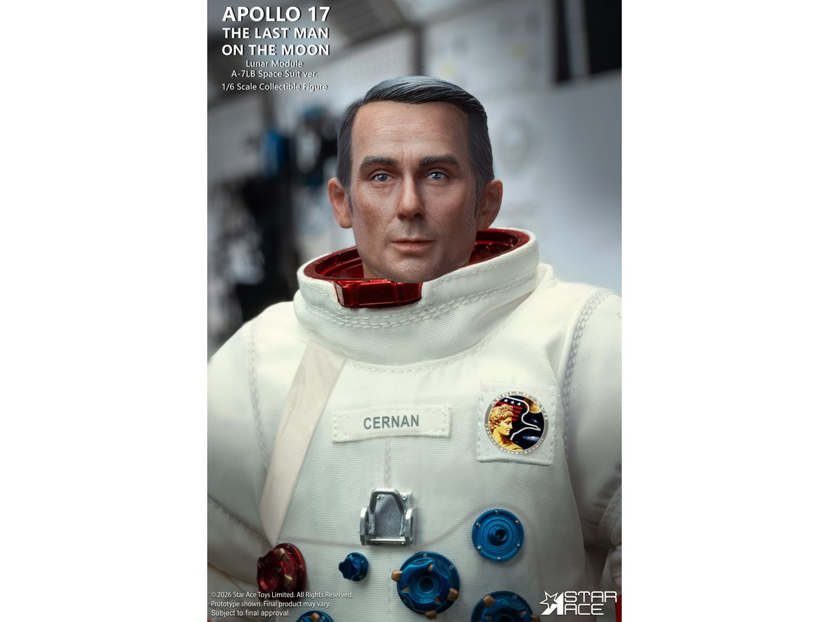 象徴的なA-7LB宇宙服を着たサーナン船長の姿を忠実に再現、人類最後の月面探査で実際に着用された宇宙服を忠実に再現するため、ステッチや縫い目はすべて精巧に再現されています。