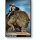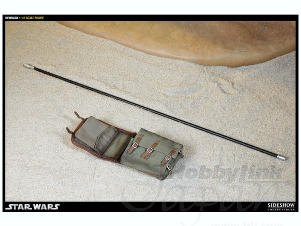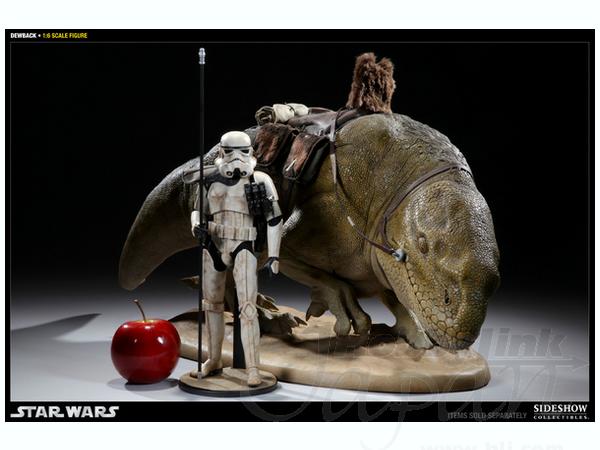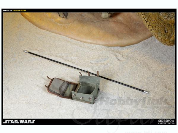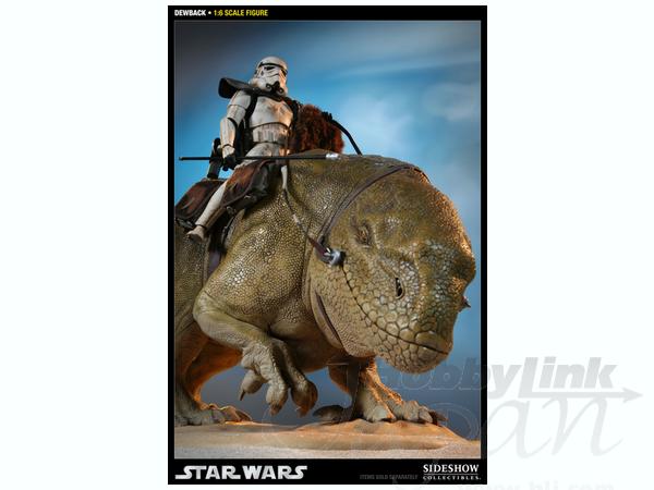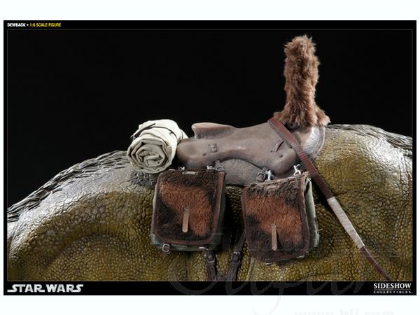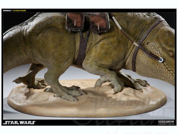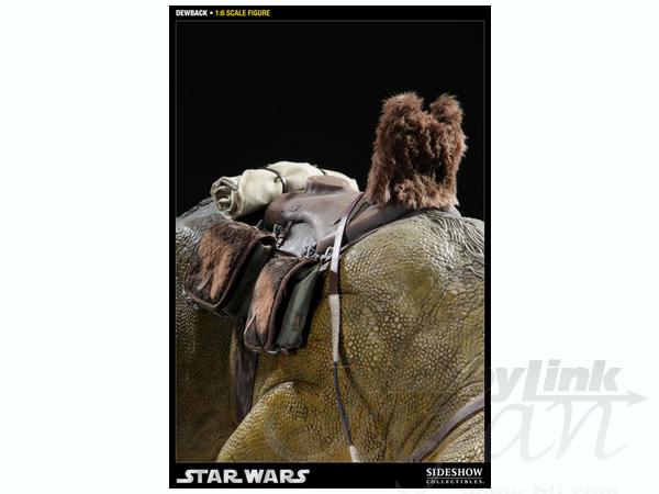 全長約76センチの巨大なフィギュアは、劇中で確認できるデューバックの身体的特徴や、爬虫類特有の皮膚の質感までを見事に再現。劇中プロップそのままに造形されている手綱やサドルなど乗用獣デューバックならではのアクセサリーが付属するのも大きな魅力だ。砂漠を模した台座が付いているので、サンドトルーパー(別売り)や、同スケールの様々なフィギュアと併せてディスプレーすることで、惑星タトゥイーンの数々の名場面が再現できる優れモノだ。