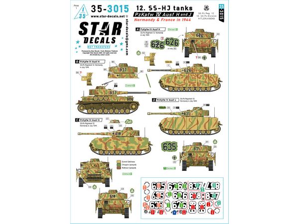 1944年、フランスのノルマンディーで戦ったドイツ第12SS装甲師団ヒトラーユーゲントに所属するIV号戦車H型およびJ型のマーキングを収録します。