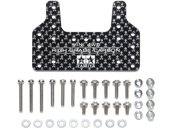 軽く強度の高いカーボンプレートは独特なパターンがレーシングムードを高め、タミヤマークや製品ロゴをホワイトで印刷しました。