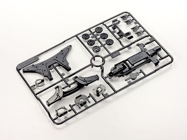 シャーシ本体やローラーなどのAパーツは軽量・高剛性のABS樹脂製とし、シャフトの軸受けには摩擦抵抗の少ないPOM樹脂を採用しているのもポイントです。