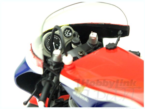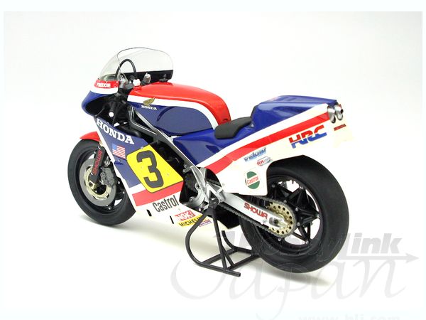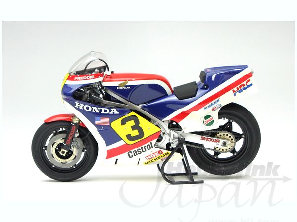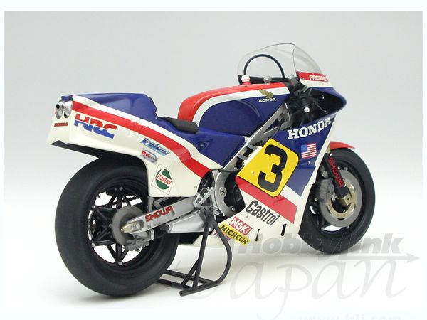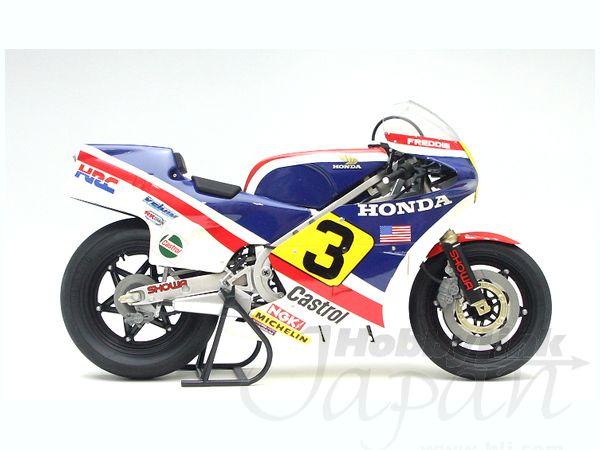 独特のV型3気筒エンジンを搭載し、1983年のロードレース世界選手権500ccクラスのチャンピオンマシンに輝いたHondaのワークスマシン、NS500のプラスチックモデル完成品です。V型3気筒という特異なレイアウトの水冷2ストロークエンジンやダブルクレードルタイプのフレームなど、メカニズムをリアルに再現。前後タイヤは質感あふれるソリッドゴム製。独特なコムスターホイールも立体感ある仕上がりです。ホワイト、レッド、ブルーの鮮やかなトリコロールカラーは美しい光沢が魅力のウレタン塗装仕上げ。また、エンジンパーツの中にウェイトを入れ、重量感を演出しました。ウインドウパッケージを採用して、箱から出さずにディスプレイすることも可能です。ゼッケン3番はチャンピオンを獲得したF.スペンサー選手のマシンです。