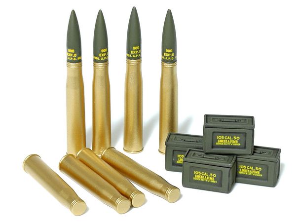 ・情景製作に役立つ砲弾や薬きょう、M2重機関銃の弾薬箱を用意し、砲弾と弾薬箱のステンシルはスライドマークで表現しました。