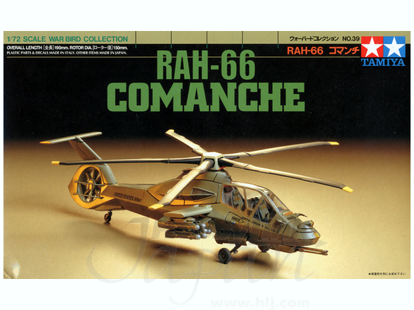 AH-1コブラやOH-6カイオワなどが行っている攻撃、偵察、観測任務を1機種で引き継ぐアメリカ陸軍の次期小型多用途ヘリコプター、RAHコマンチのプラスチックモデル組み立てキットです。平面で構成された精悍なスタイルを、シャープな凹線のパネルライン仕上げでモデル化しました。サイドコンソールやシートなどコクピット内部も立体感豊かに再現。ヘルファイヤー対戦車ミサイルなど豊富な武装パーツが小柄な機体に迫力を加えます。アメリカ陸軍に配備されたプロトタイプ1号機のデカールをセットしました。 (タミヤホームページより)