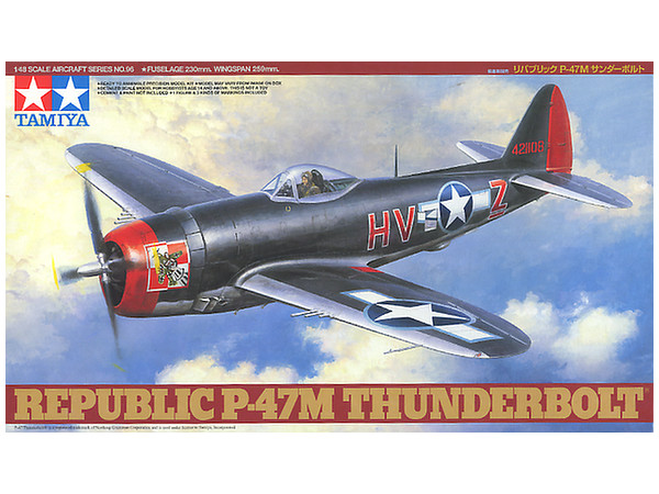 第二次大戦中のアメリカ陸軍航空隊を代表する傑作戦闘爆撃機P-47サンダーボルト。後期に生産されたタイプではスピードブレーキを装備し、垂直尾翼前方に横方向の安定性を補うドーサルフィンを取り付けた機体も見られます。P-47Mはその数多い派生型の中で高速化する敵機に対応するため開発されました。最大出力2800馬力のP&W R-2800-57エンジンとCH-5排気タービン過給器を搭載して実用レシプロ機でトップクラスの756km/hを発揮。大戦終盤の1945年1月から第8空軍の第56戦闘航空群に配備され、強敵であるドイツ空軍のジェット戦闘機Me262を撃墜する戦果もあげたのです。大戦終盤に登場したシリーズ最速のサンダーボルト、P-47Mのプラスチックモデル組み立てキットです。●1/48スケール、全長230mm、全幅259mm。太い胴体や大出力エンジンを包むカウリングなど量感あふれるスタイルをリアルに再現。●胴体背面のドーサルフィンは3種類をセット。フィンのない胴体パーツも用意して、D型からM型まですべてのバブルトップを再現できます。●初期の生産タイプとは異なるコクピット内部や、追加されたスピードブレーキも忠実に再現。●主翼フラップは別パーツとしてアップ、ダウン状態を選択可能。プロペラは4種類を用意。●3種類の増槽や500ポンド爆弾など兵装パーツも豊富にセット。●パイロットの人形1体、個性的なマーキング3種類付き。 (タミヤホームページより)