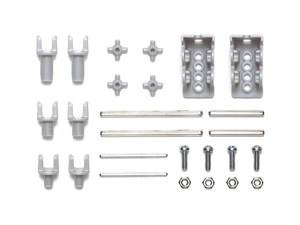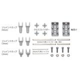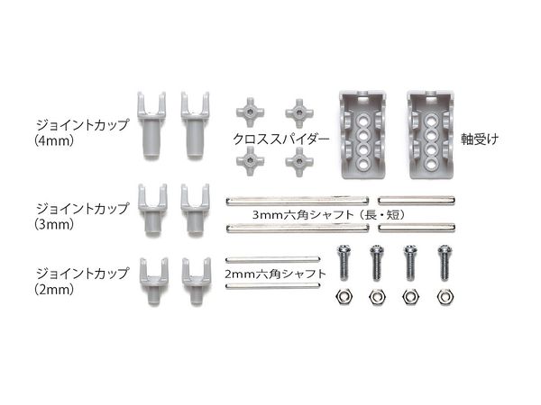3種類のジョイントカップをはじめ、クロススパイダー4個、軸受け2個、2×33mm、3×27mm、3×50mm六角シャフト各2本などをセット