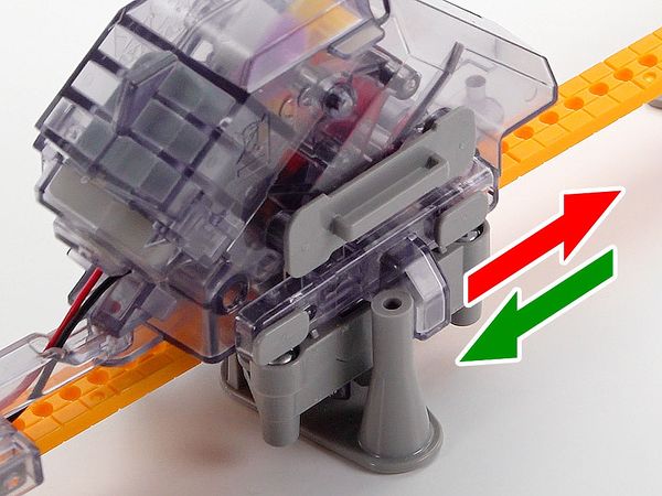 ・レールに取り付けたストッパー部品に切り替えレバーがあたると、ギヤの位置が変わりタイヤが逆回転。
