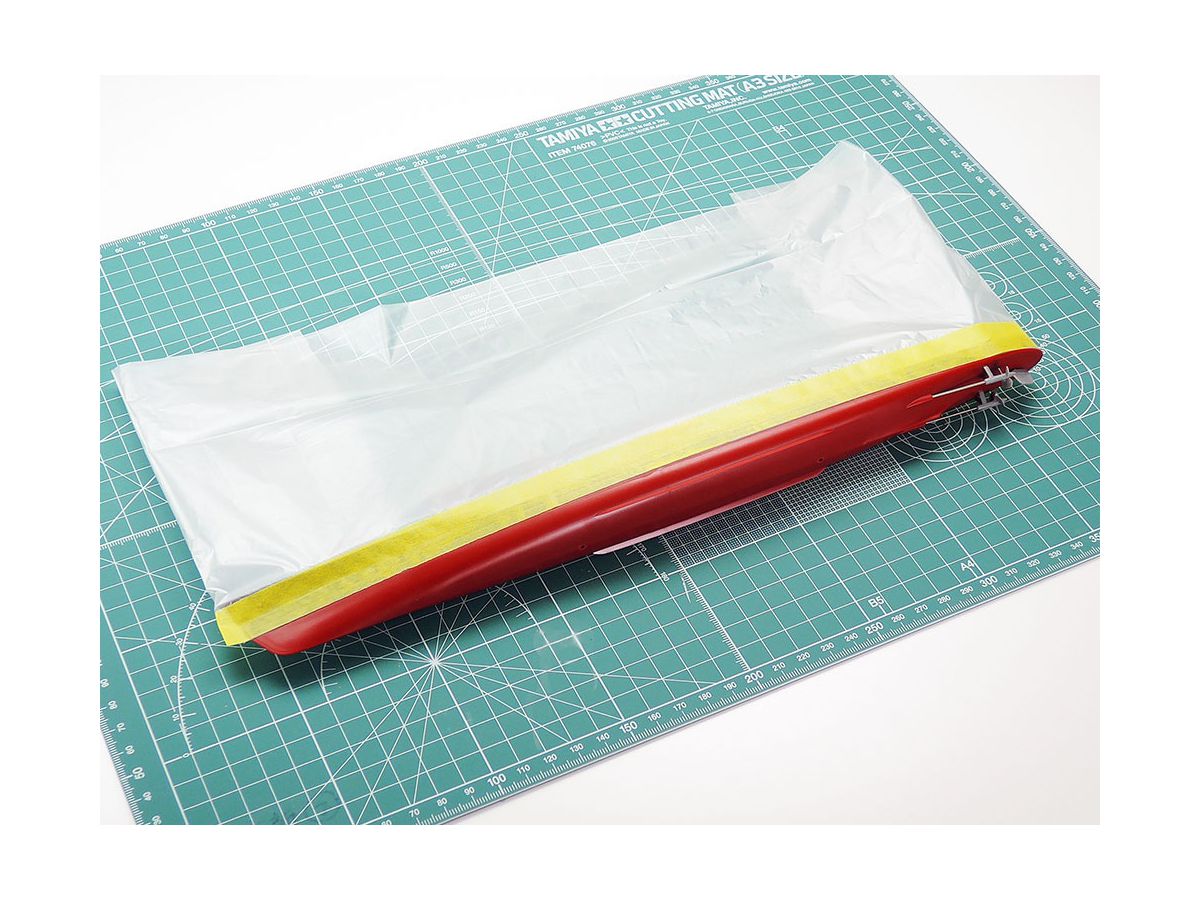テープを貼り付けた後、折りたたまれたシートを広げれば、手軽に広い面積のマスキングが可能です。