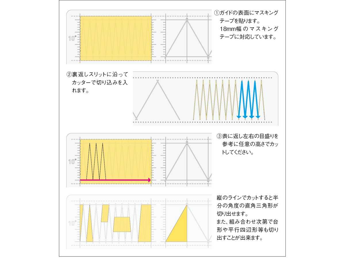 マスキングテープを10°・15°・20°・30°・36°・45°・50°・60°の二等辺三角形に切り出すためのカッティングガイドです。