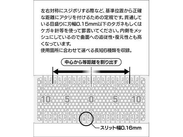 貫通している目盛りに刃幅0.15mm以下のタガネもしくはケガキ針等を使って罫書いてください。