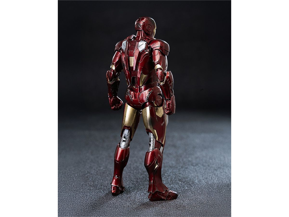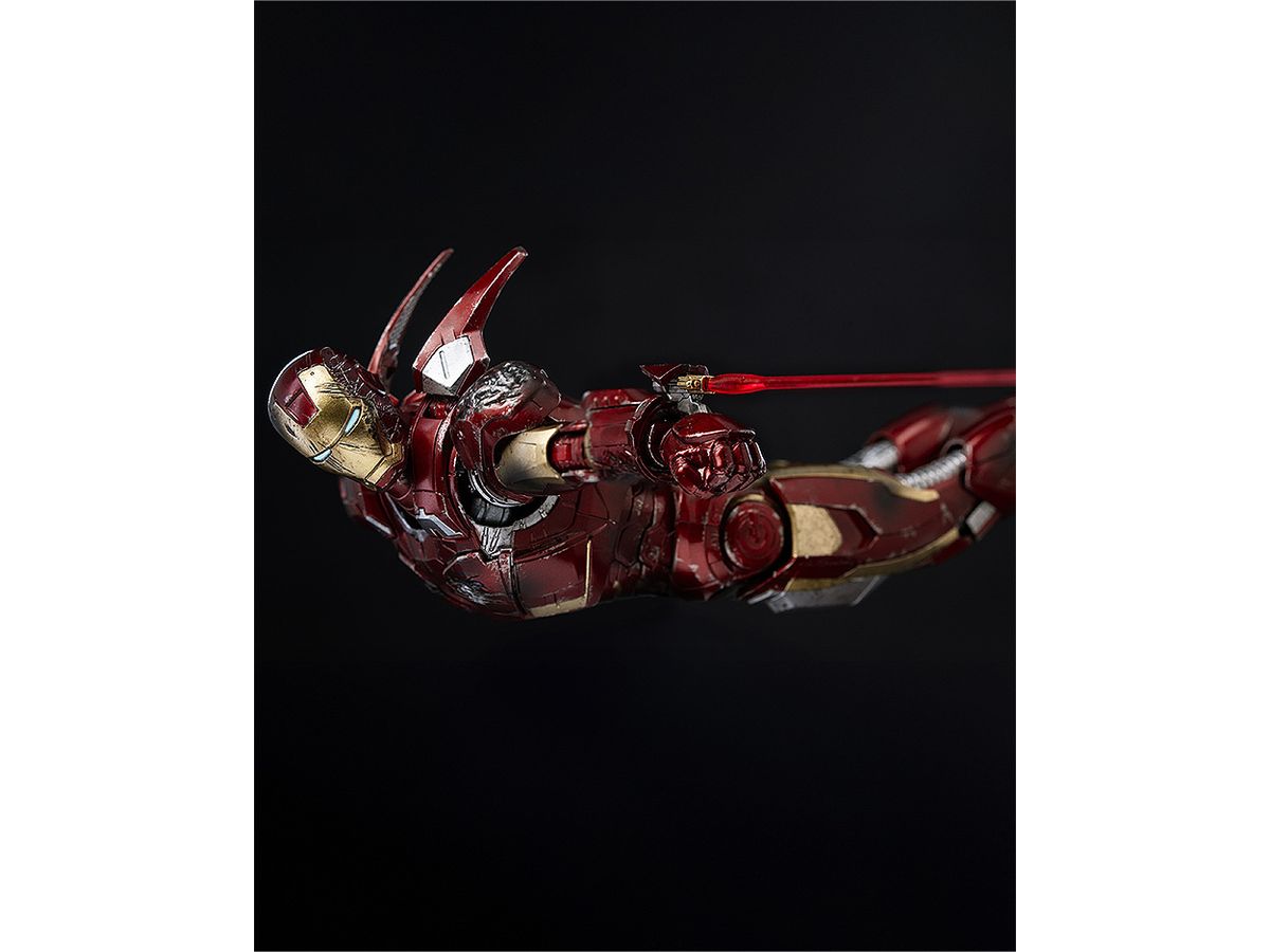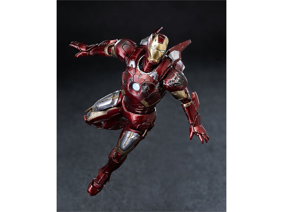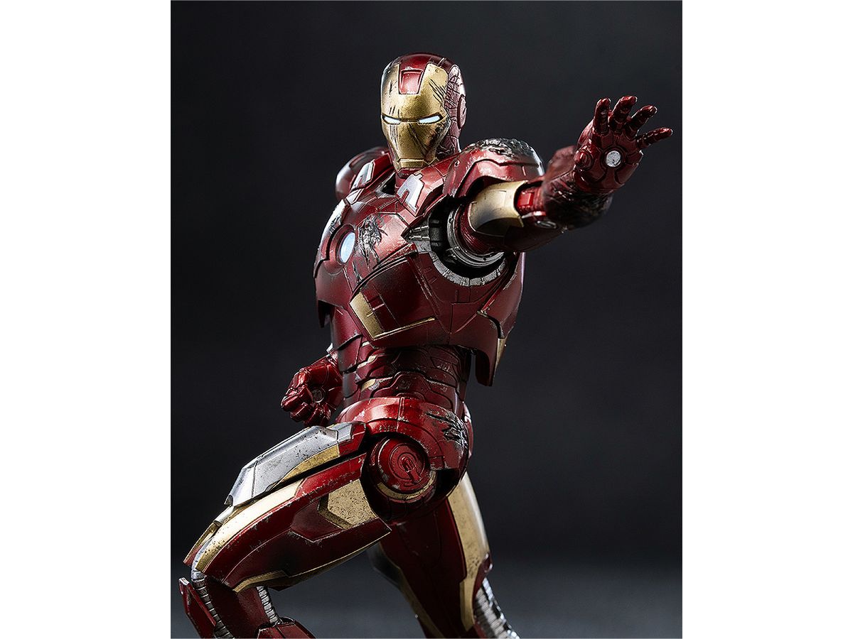 お馴染みのレッドとゴールドのカラーリングをマルチレイヤーメタリックコーティングで表現し、全身に被弾痕やスレキズなどの造形と塗装を施すことでマーベル・スタジオの『アベンジャーズ』シリーズ劇中で見られるトニー・スタークのアーマースーツが戦いで傷ついた姿をリアルに再現しています。