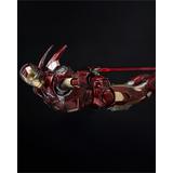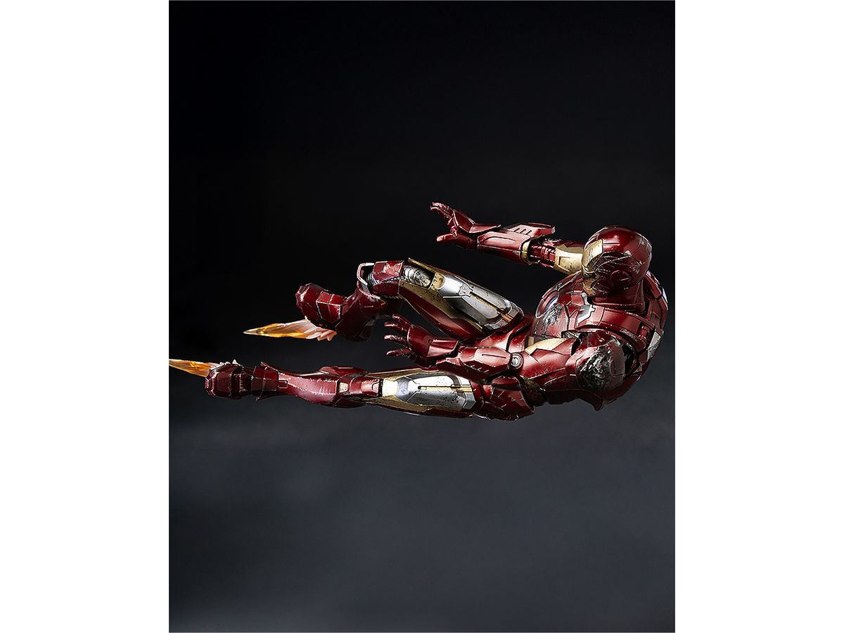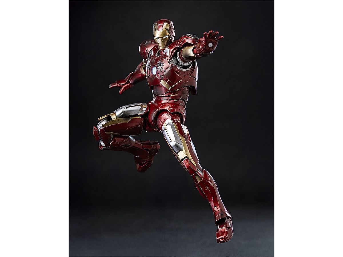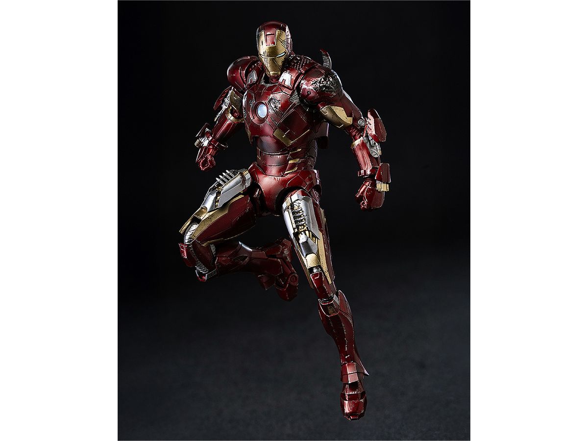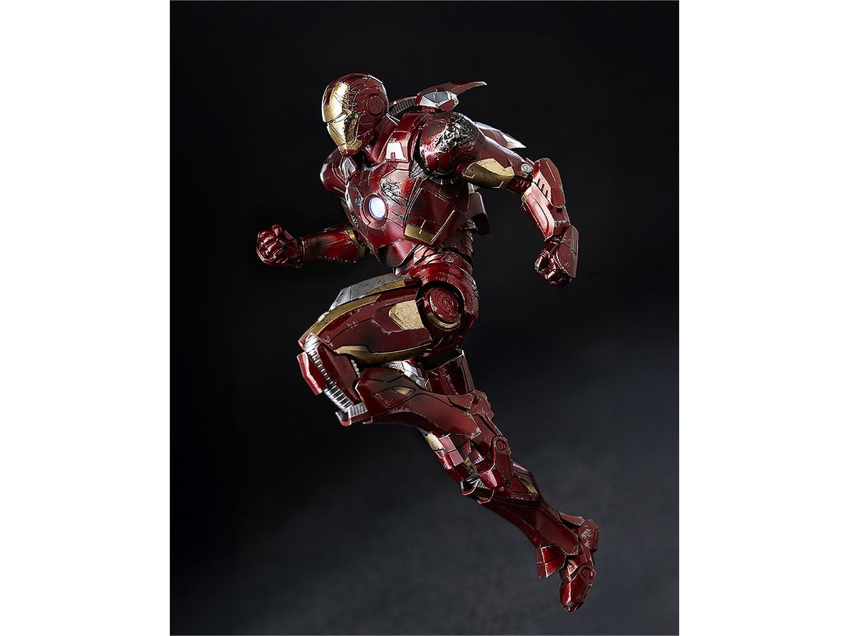 お馴染みのレッドとゴールドのカラーリングをマルチレイヤーメタリックコーティングで表現し、全身に被弾痕やスレキズなどの造形と塗装を施すことでマーベル・スタジオの『アベンジャーズ』シリーズ劇中で見られるトニー・スタークのアーマースーツが戦いで傷ついた姿をリアルに再現しています。