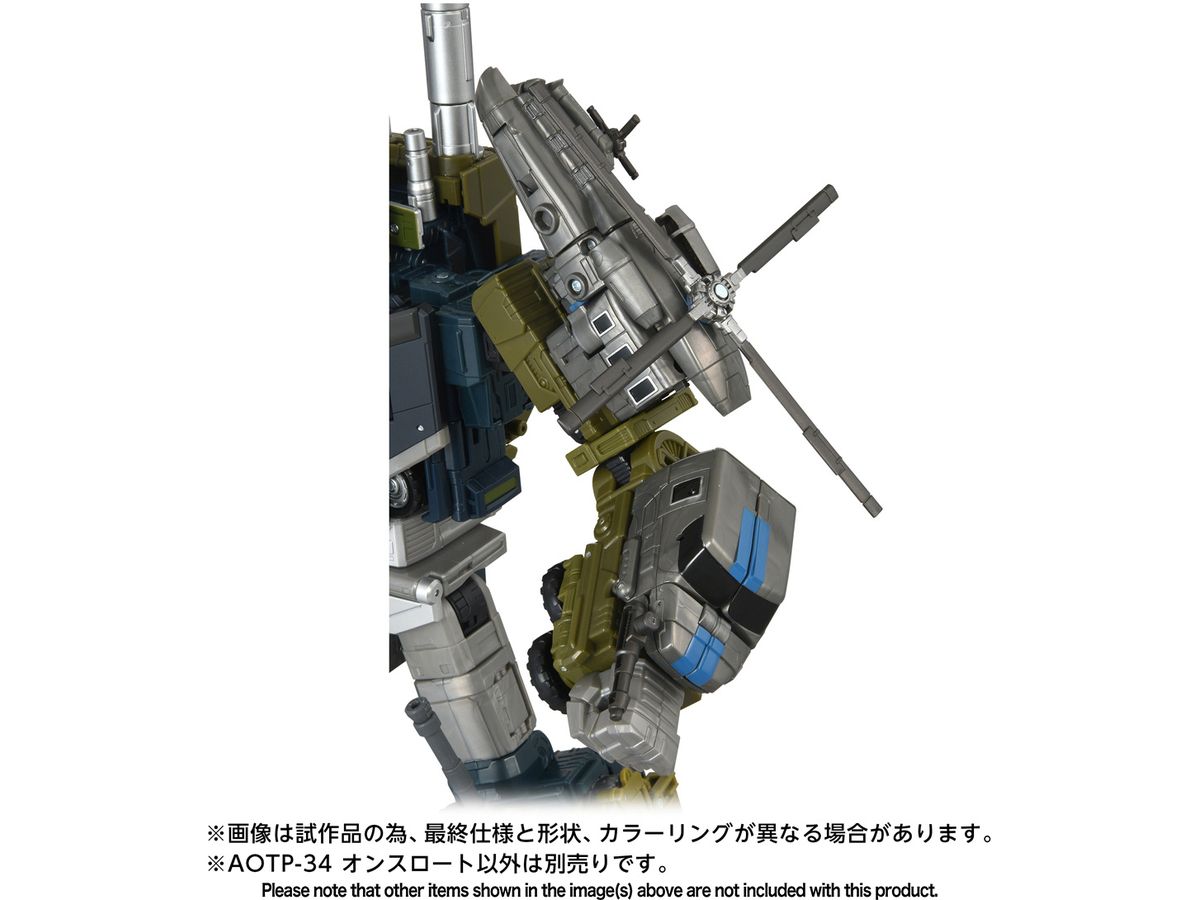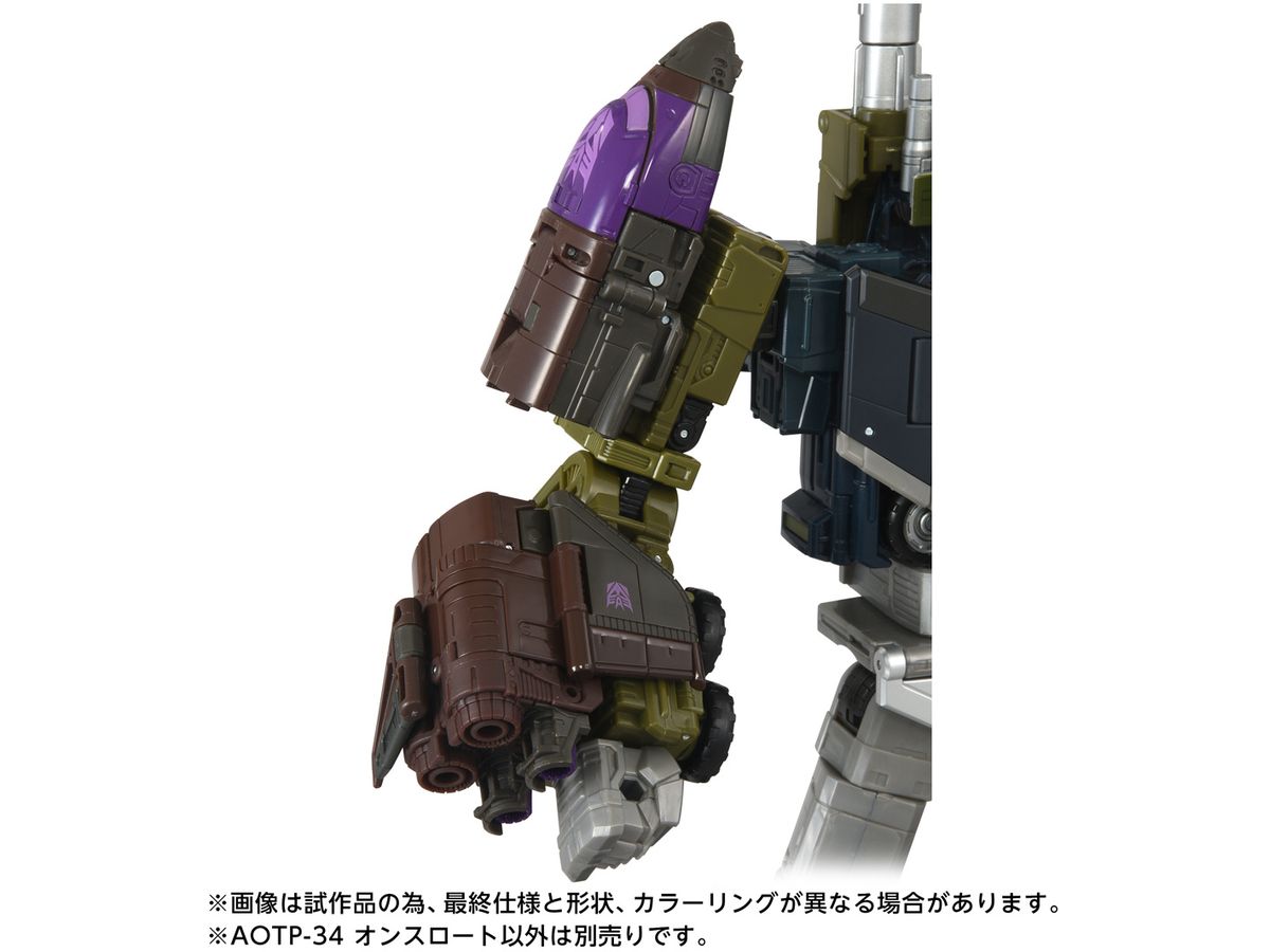 また、オンスロートを中心に5体のコンバッティコン(AOTP-34 オンスロート以外は別売り)と合体することで巨大兵士ブルーティカスが完成(オンスロートはボディに合体)します。