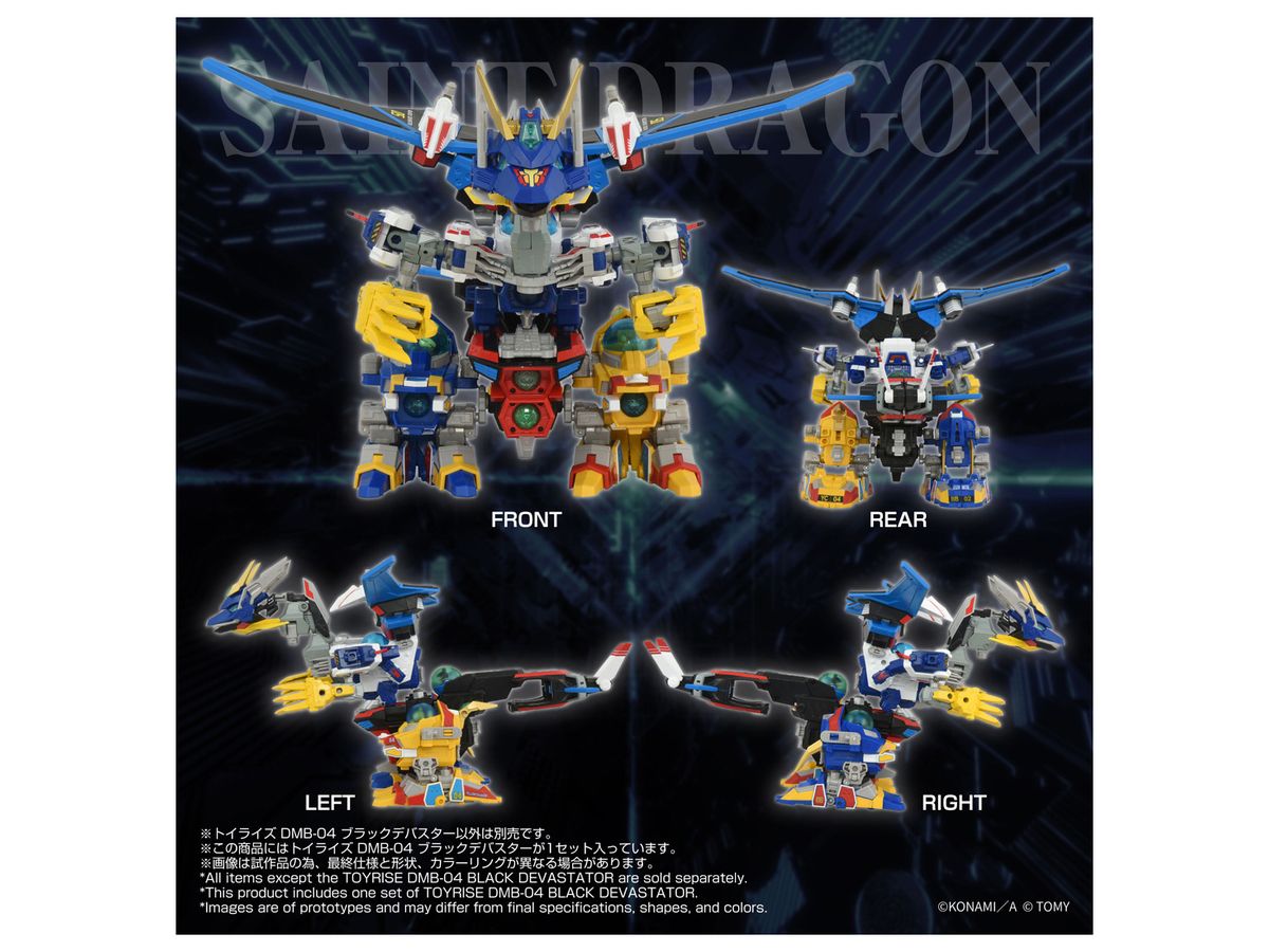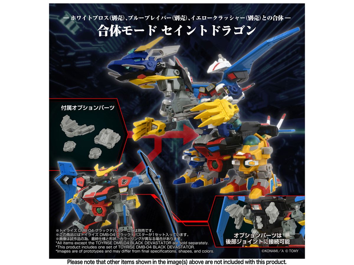 トイライズ DMB-01 ホワイトブロス(別売)、DMB-02 ブルーブレイバー(別売)、DMB-03イエロークラッシャー(別売)との合体モード「セイントドラゴン」も実現!※ビー玉やピンポン玉の発射機能はございません。