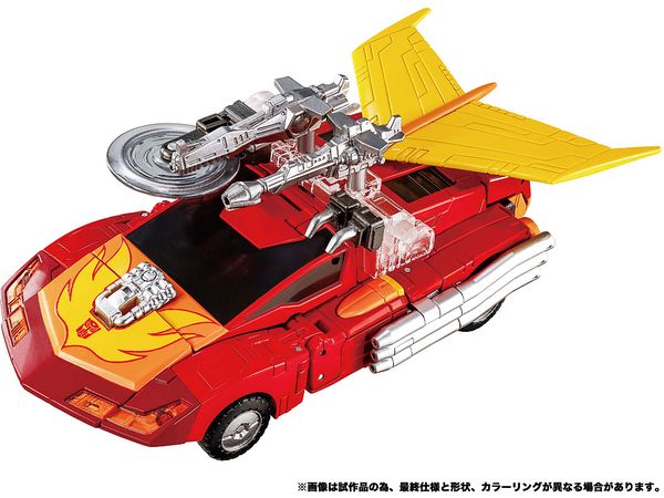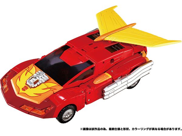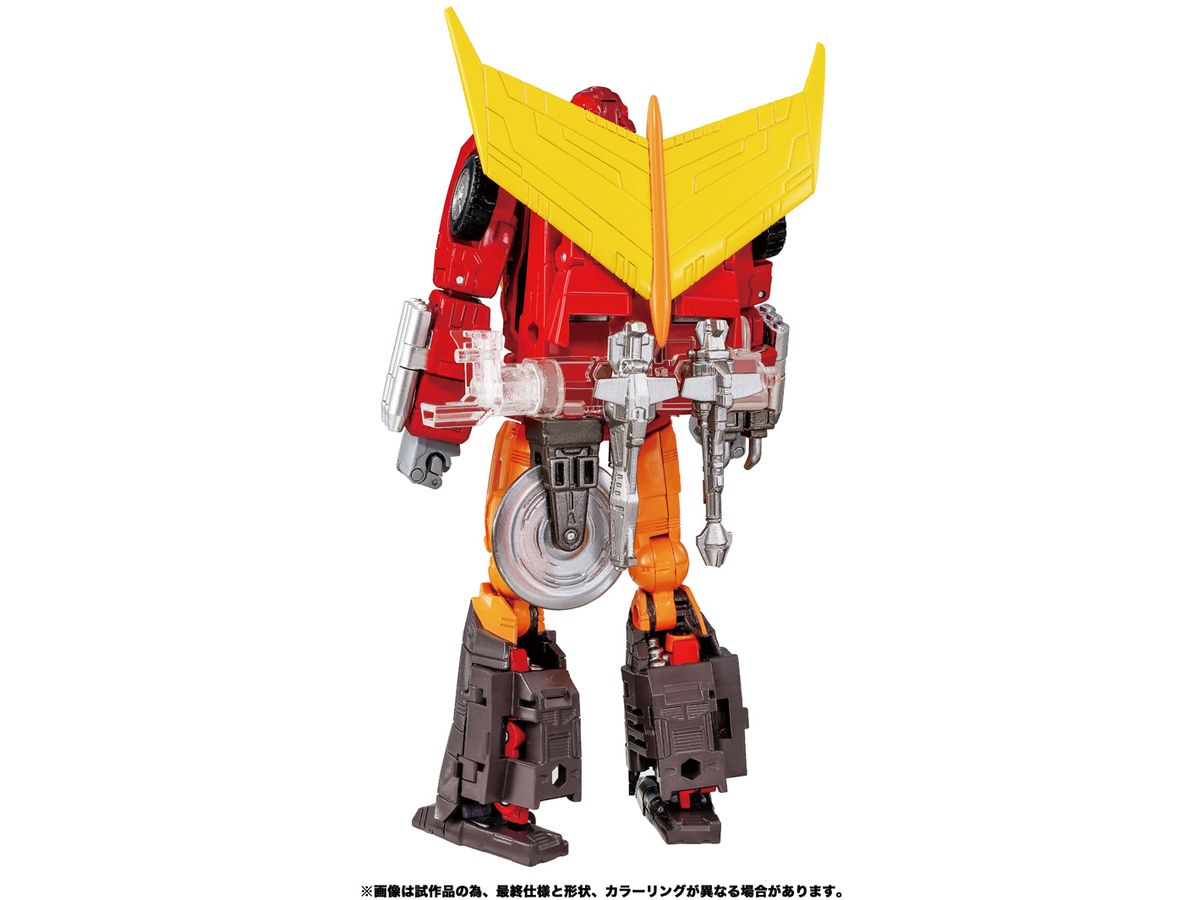 ③大きなリアウイングと特徴的なファイヤーパターンなど、ホットロッドらしいデザインを保ったまま、余剰パーツの存在しない「完全変形」を演出。
