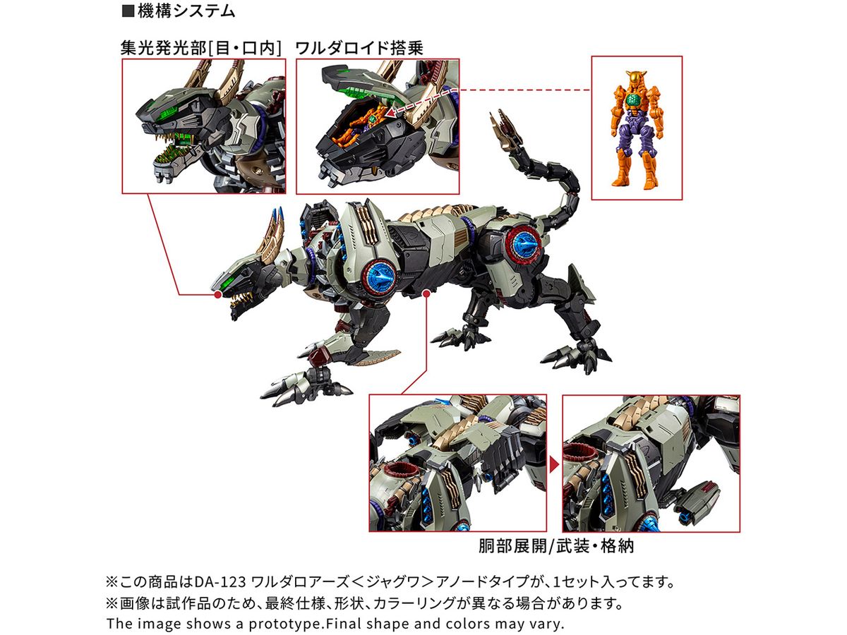 ワルダロアーズ <ジャグワ>は従来のワルダーメカ同様に変幻自在な形態変化機能も備えており、疾走や跳躍に適した4足歩行形態、接近格闘に適した2足歩行形態、機体を2機に分離した多重攻撃形態 等の状況に応じた単体可変は勿論、エヴォライズ等の他機体との強化結合合体能力も備えている。