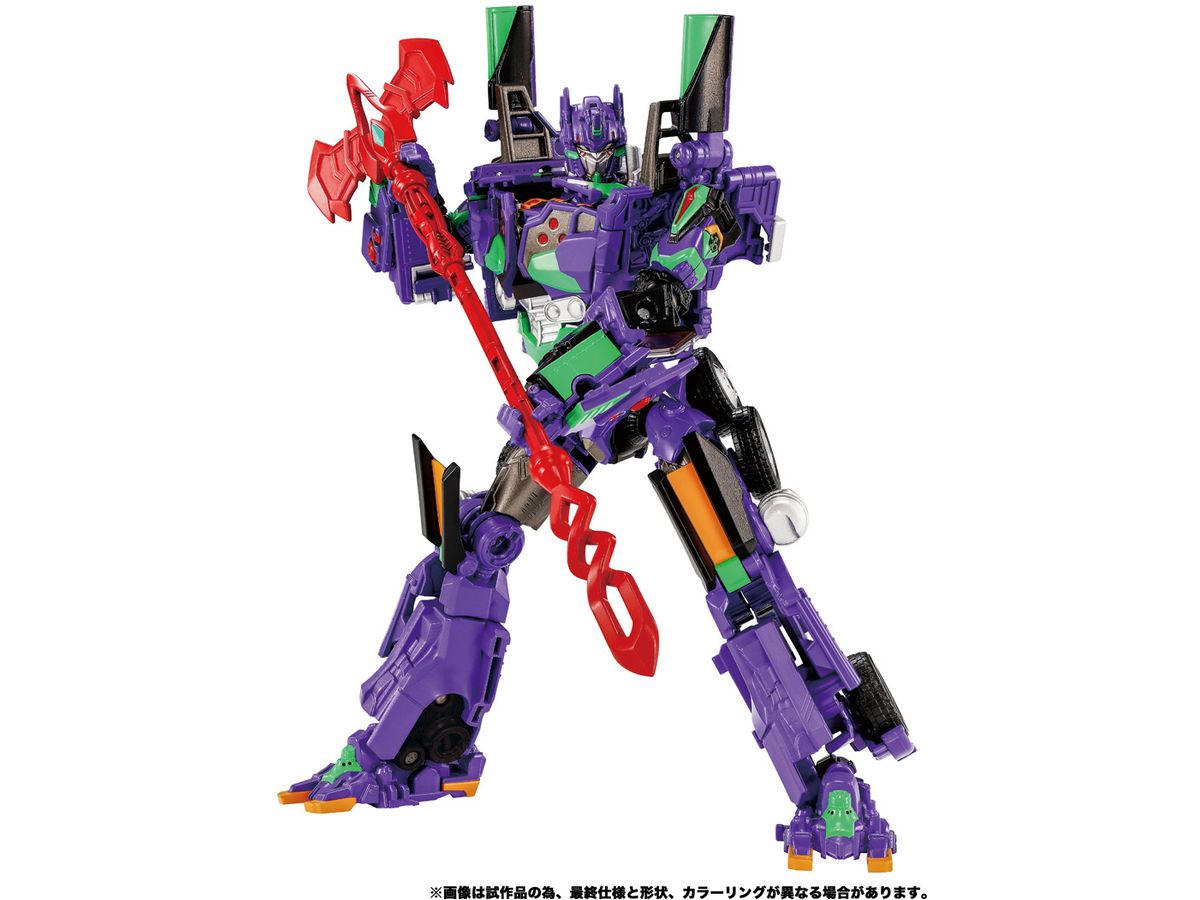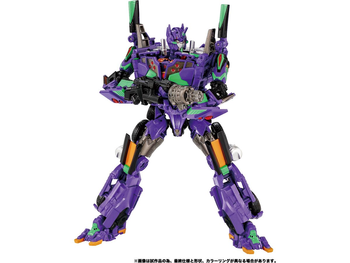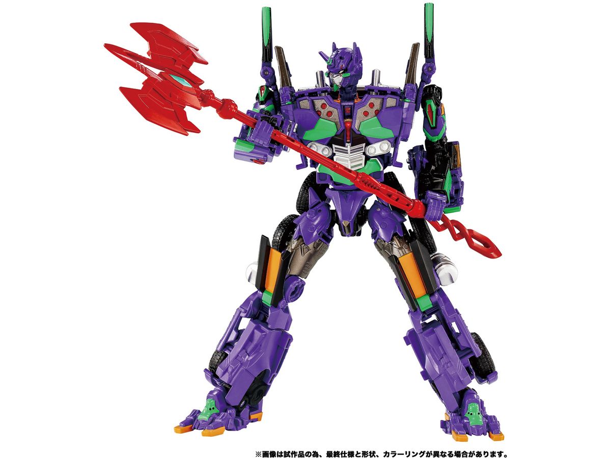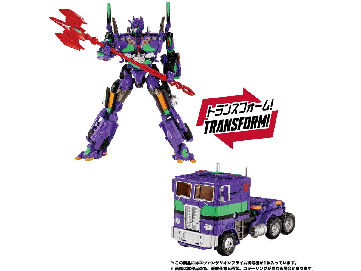 オプティマスプライムがエヴァンゲリオン初号機の特徴的な意匠とカラーを身にまとい、「エヴァンゲリオンプライム初号機」となって登場。