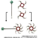 肩部の円盤カッター状のユニットはブレードの組み換えが可能で 8枚刃の手裏剣状の武器や腕に接続する大型クロー、鎌型の手持ち武器等にカスタマイズ出来る。