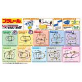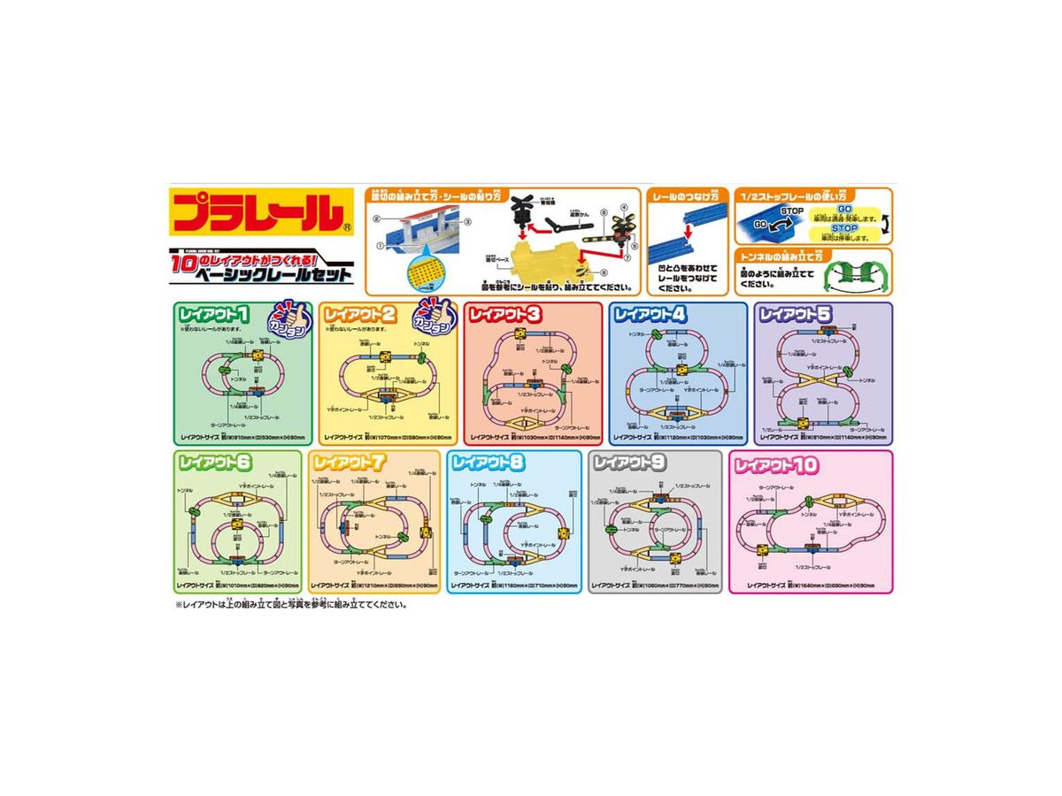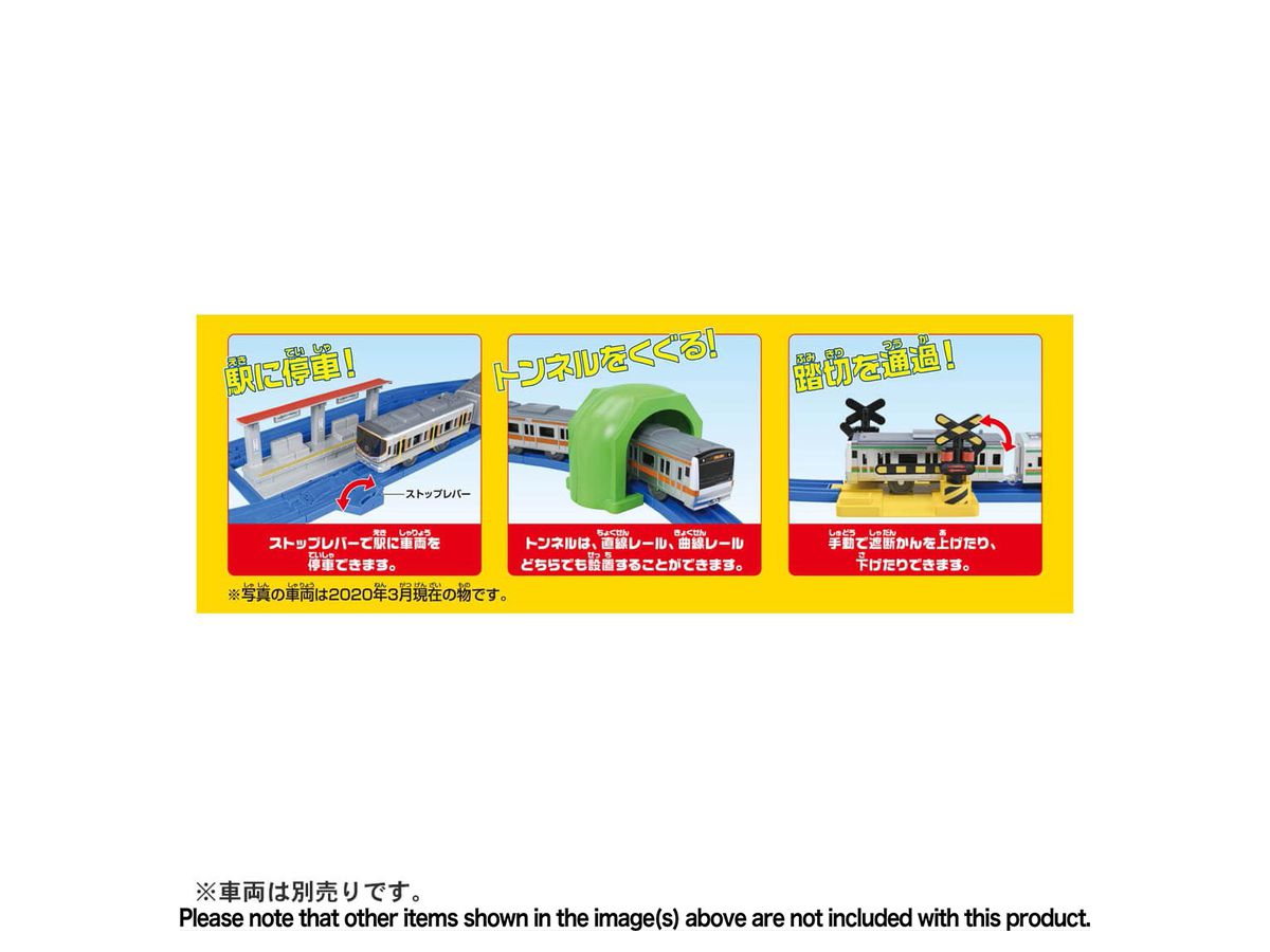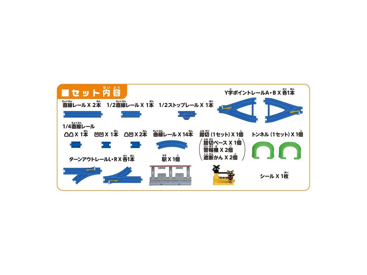 直線レール(2)、曲線レール(14)、1/2直線レール(1)、1/2ストップレール(1)、1/4直線レール(凸凹)(2)、1/4直線レール(凸凸)(1)、1/4直線レール(凹凹)(1)、ターンアウトレール(L・R)各(1)、Y字ポイントレール(A・B)各(1)、踏切ベース(1)、警報機(2)、遮断かん(2)、駅(1)、トンネル(2パーツ)(1)、シール(1)