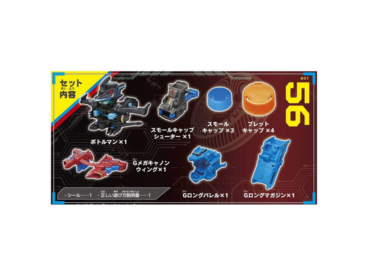 ボトルマン(基本本体)(1)、スモールキャップシューター(1)、メガキャノンアーム(左右一式)(1)、バレル(1)、マガジン(1)、ノーマルキャップ(4)、スモールキャップ(3)、シール(1)、正しい遊び方説明書(1)