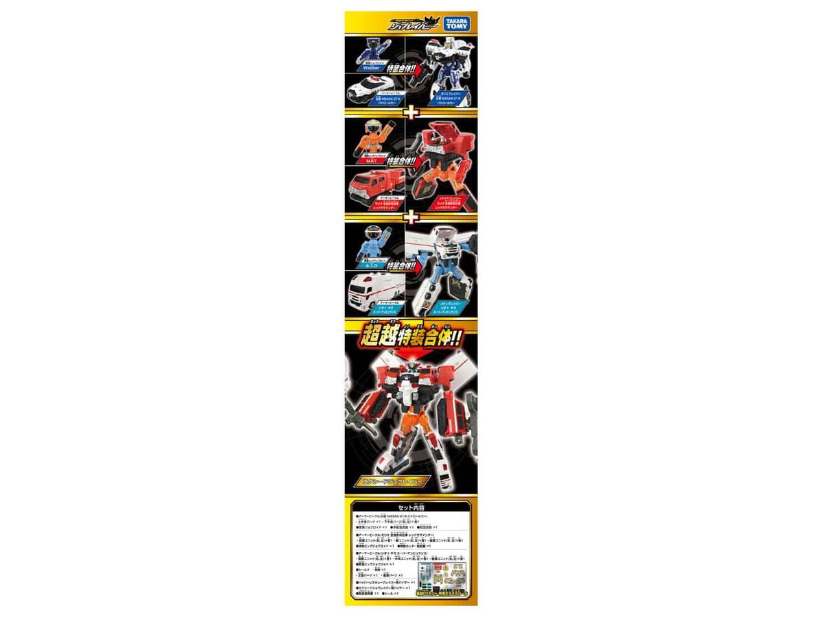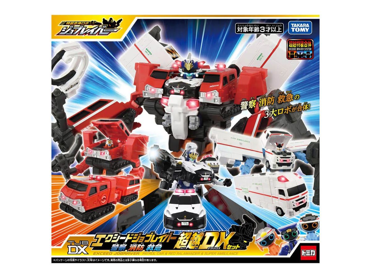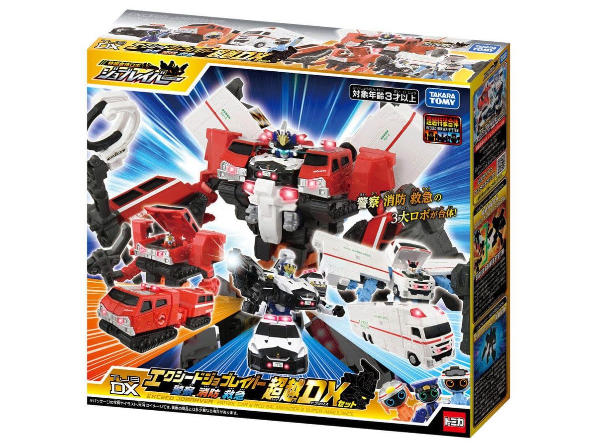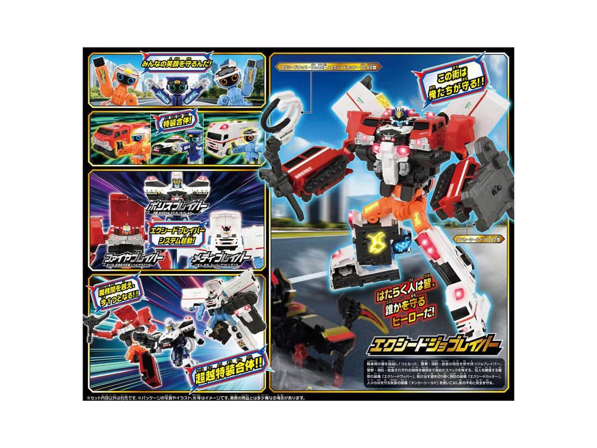「ポリスブレイバー 日産 NISSAN GT-R パトロールカー」と「ファイヤブレイバー モリタ 全地形対応車 レッドサラマンダー」と「メディブレイバー いすゞ ギガ スーパーアンビュランス」が超越特装合体をして「エクシードジョブレイバー」になるぞ!