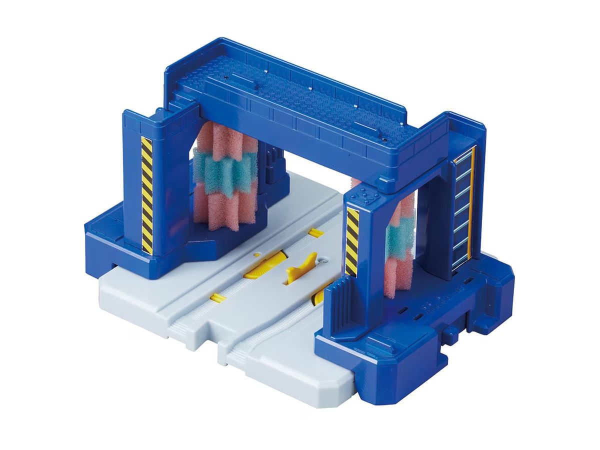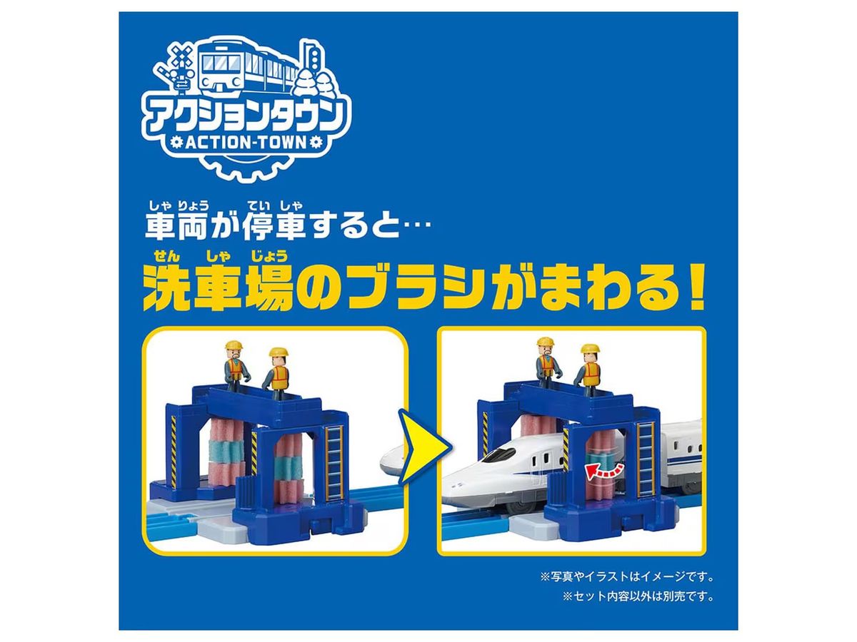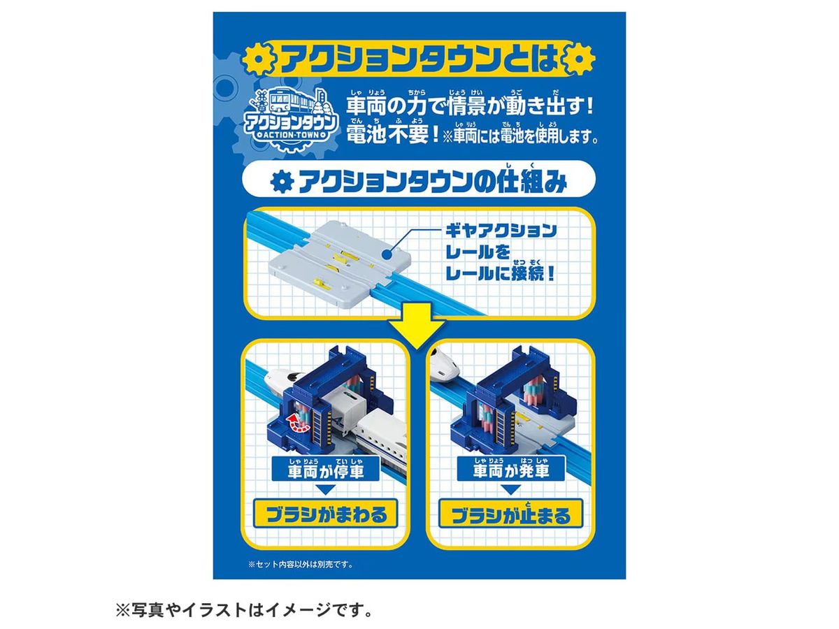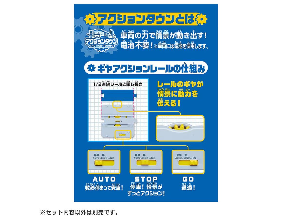 車両の力で情景が動き出す!アクションタウンのぐるぐる洗車場が登場! 車両が到着すると自動で洗車場のブラシがまわる! 付属のギヤアクションレールは1/2直線レールサイズでレイアウトも組みやすい!キミだけの動き出す街を作ろう!