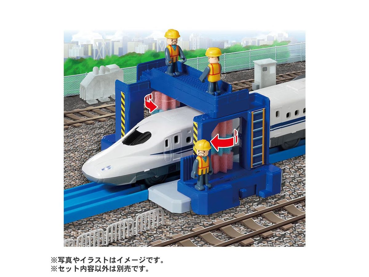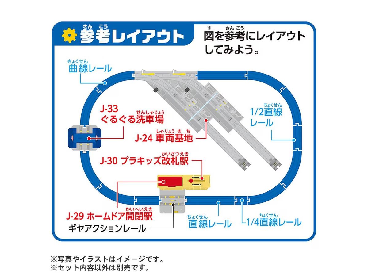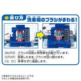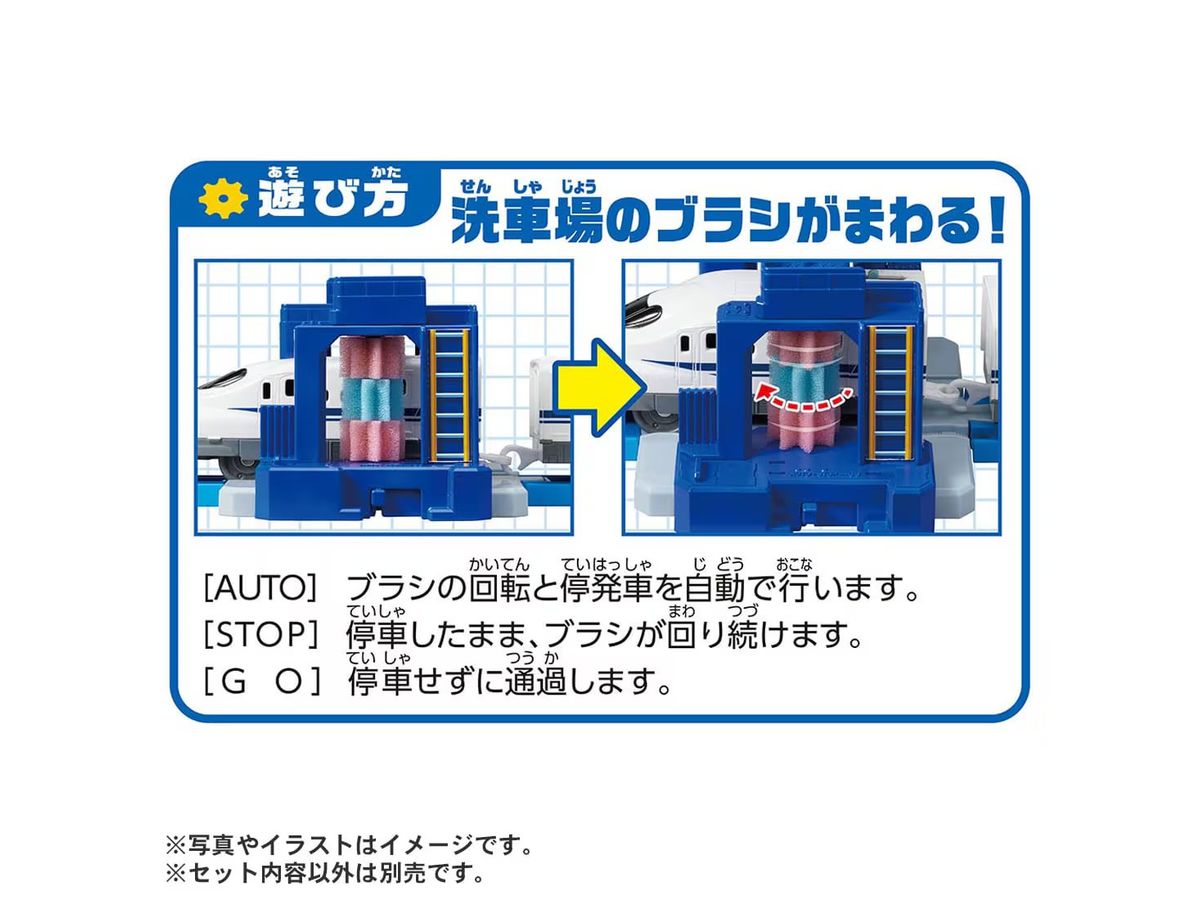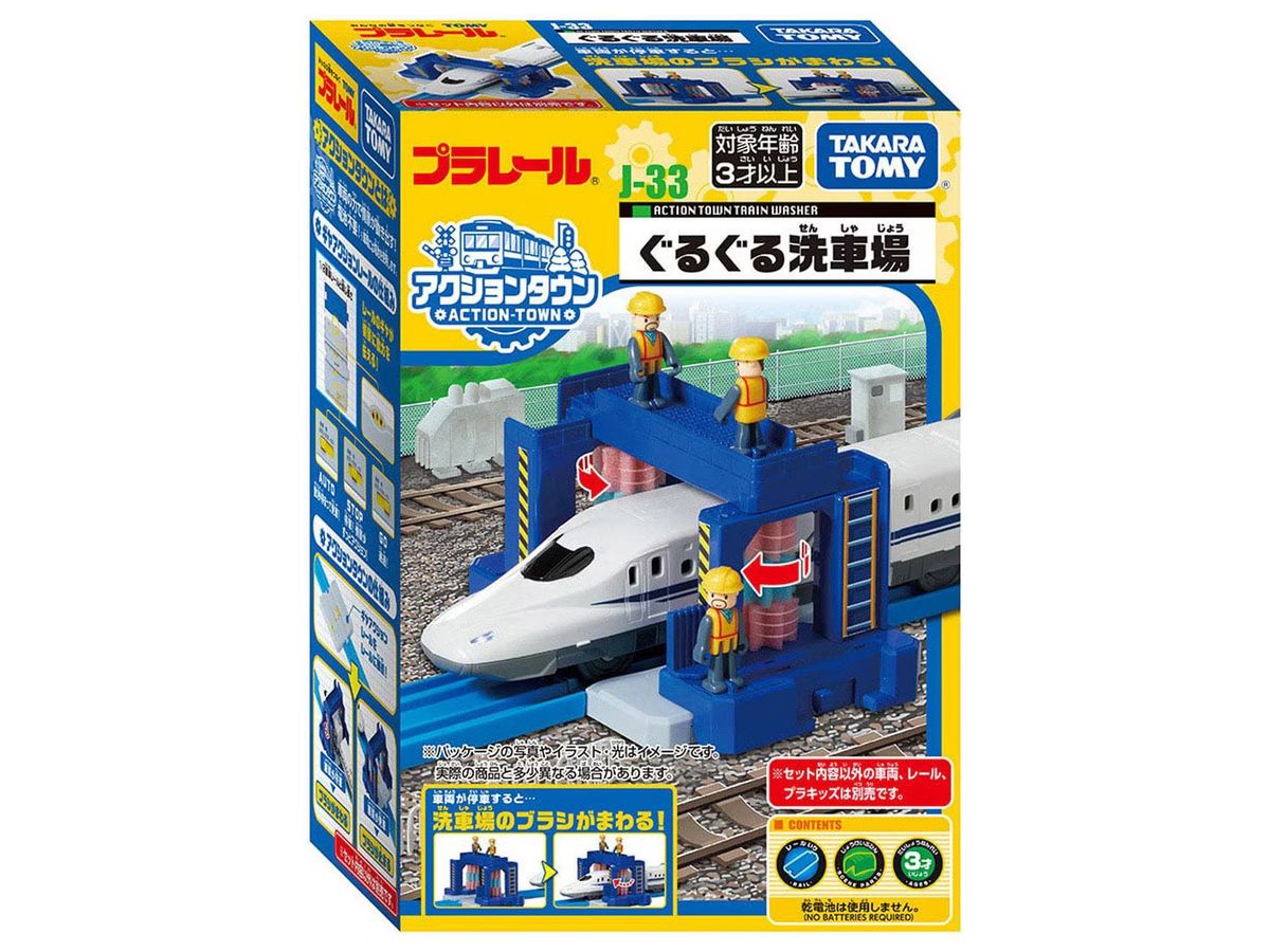 車両の力で情景が動き出す!アクションタウンのぐるぐる洗車場が登場! 車両が到着すると自動で洗車場のブラシがまわる! 付属のギヤアクションレールは1/2直線レールサイズでレイアウトも組みやすい!キミだけの動き出す街を作ろう!