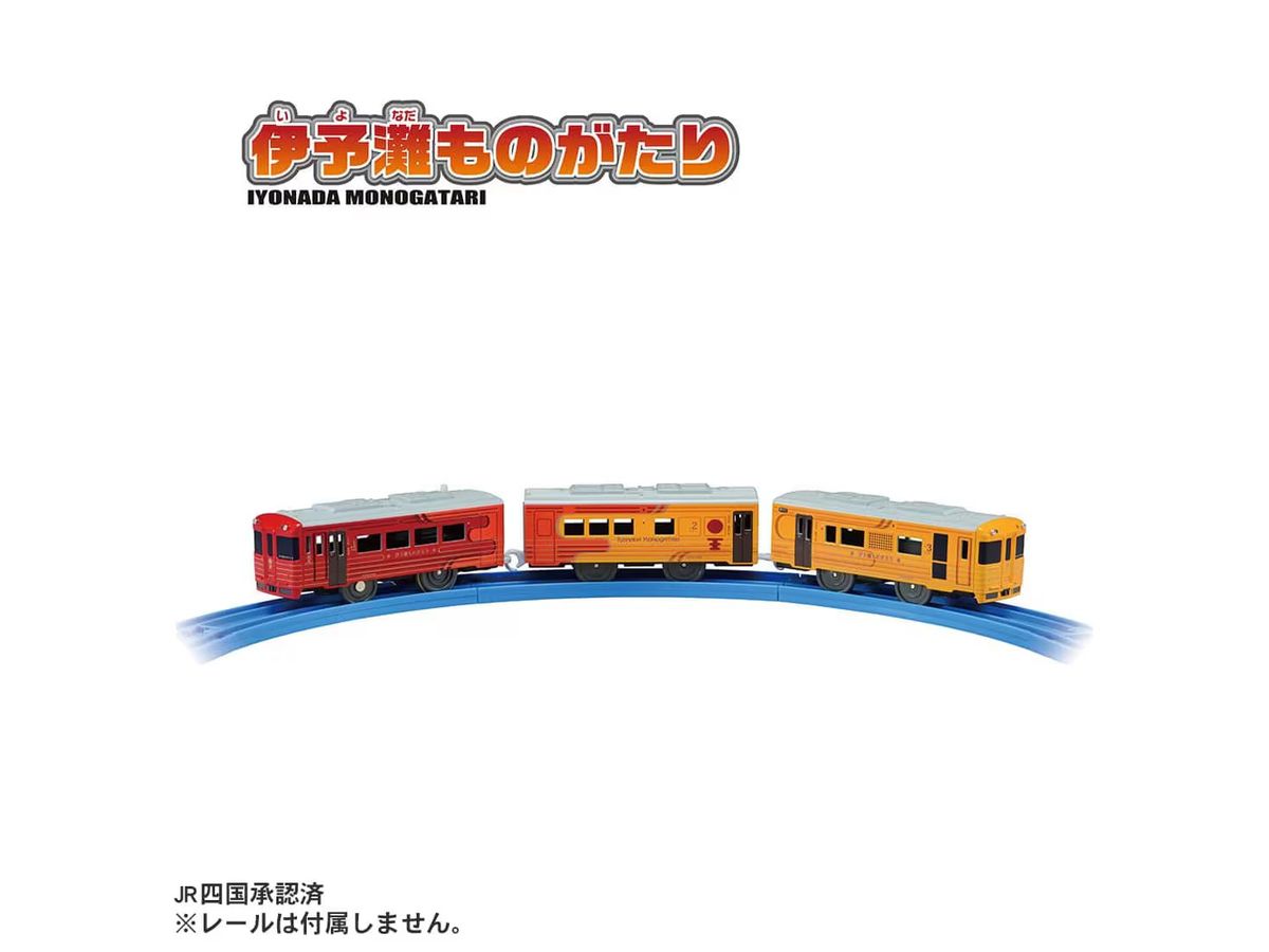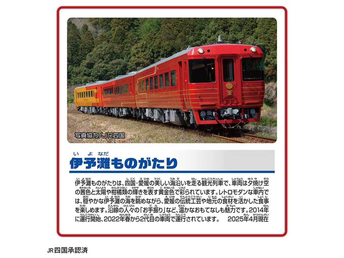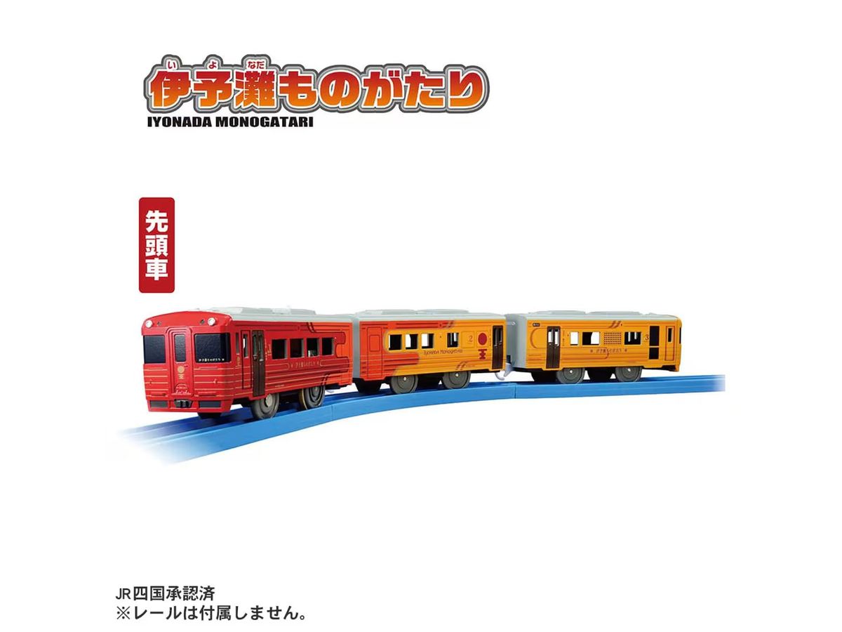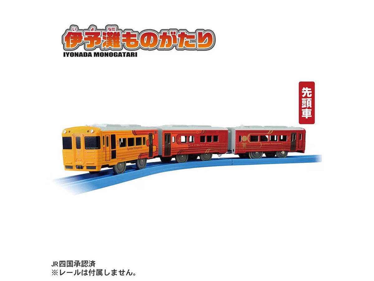 「伊予灘ものがたり」がプラレールに登場です。 「伊予灘ものがたり」は四国・愛媛の美しい海沿いを走る観光列車で、車両は夕焼け空の茜色と太陽や柑橘類の輝きを表す黄金色で彩られています。沿線の人々の「お手振り」など、温かなおもてなしも魅力の列車です。