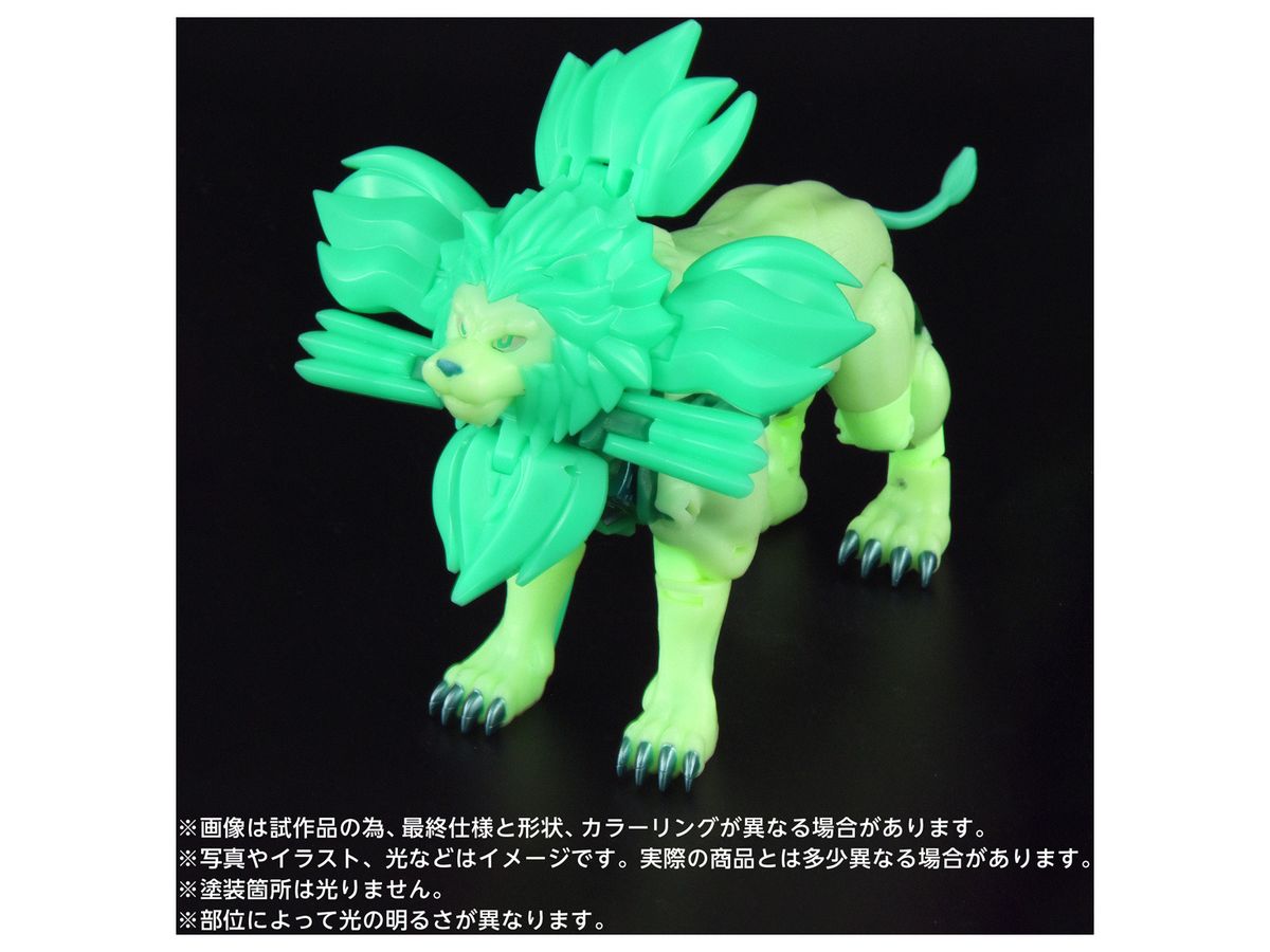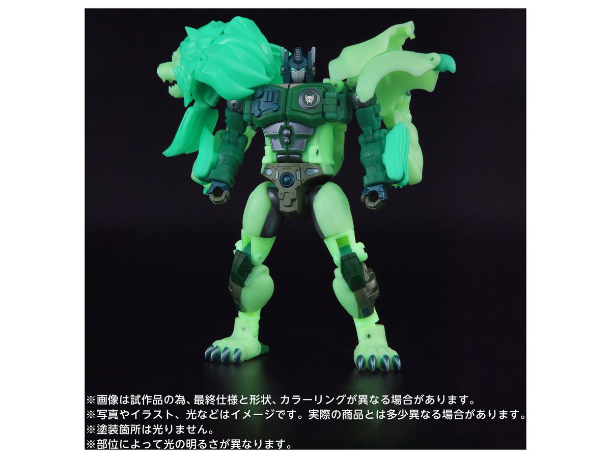 ライオコンボイ本体は蓄光素材を使用しており、光にあてた後に暗所で見るとアニメ本編をイメージさせる緑色に光る姿が再現可能!