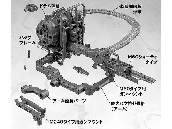 主武装となる M60機関銃 に加え、弾帯で接続されたドラム弾倉、銃火器支持外骨格ユニットが付属。