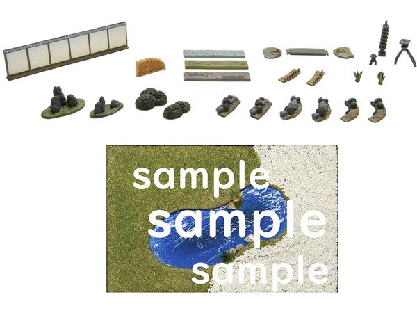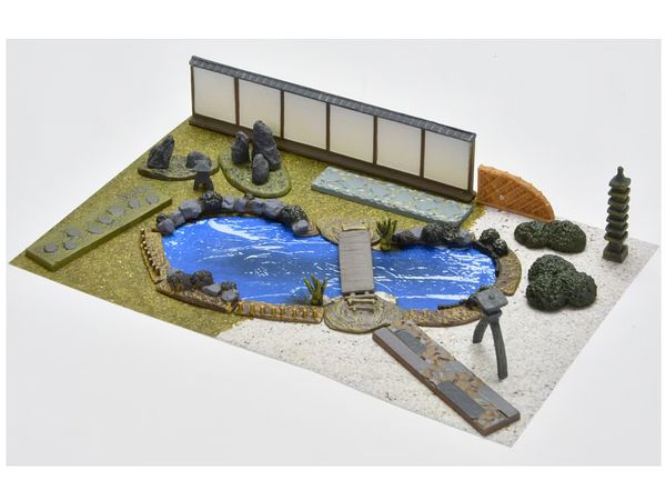 土塀、竹垣、小橋、生垣、菖蒲、石畳、池の淵4種×各2、石灯籠、庭石、ジオラマシート