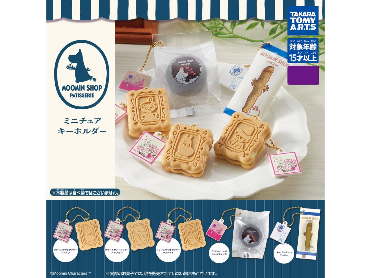 JR東京駅に常設店もオープンした「ムーミンショップ パティスリー」のお菓子が、ミニチュアキーホルダーになりました。クリームサンドクッキーは挟まれているクリームも再現されており、それぞれにパッケージデザインのプレートが付属します。本体サイズは約4cm~6cm。