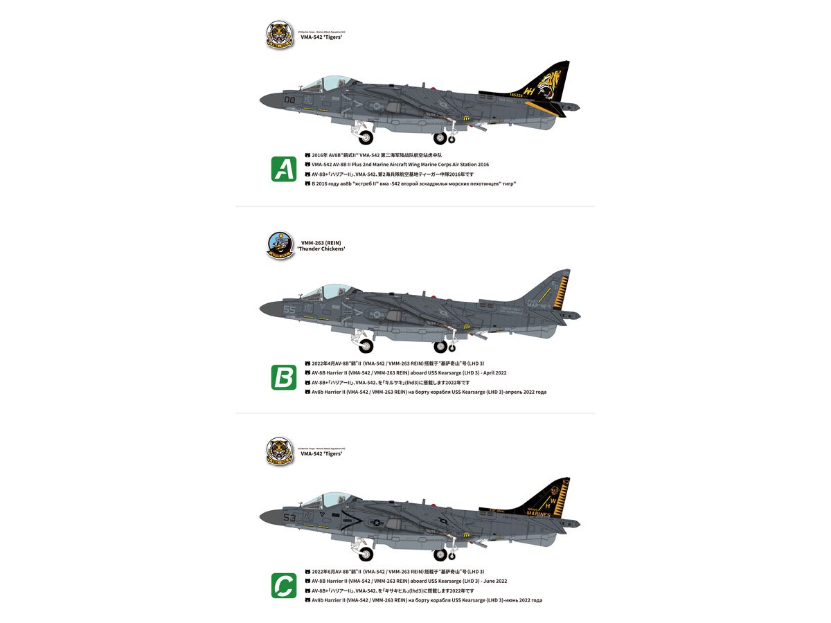 キットにはエッチングパーツと金属製パーツ、内装3Dデカールと塗装マスクシールが付属しています。マーキングオプションとして3種米海兵隊VMA-542 "タイガース" デカールが付属します。
