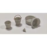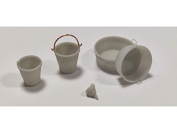水周りのジオラマなどに使える、たらい、バケツ、漏斗の3種類を再現する3Dプリント製アクセサリーパーツセットです。