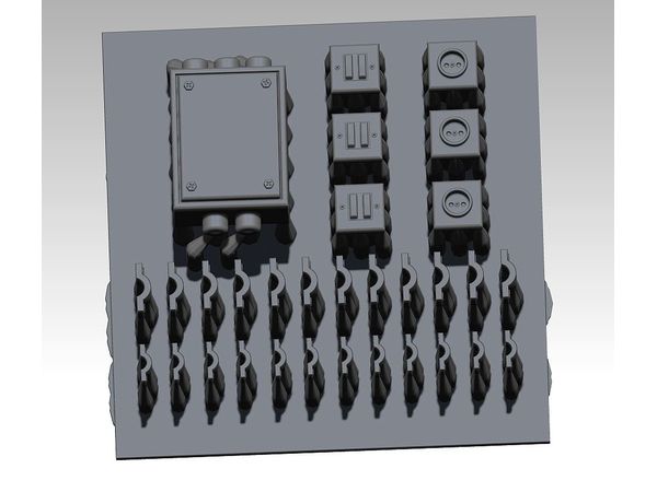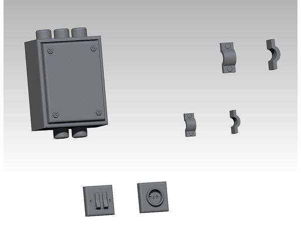 家屋や工場などに設置されている配電盤、スイッチ、コンセント、ケーブル押さえなどの電気関係の部品を再現する3Dプリント製アクセサリーパーツセットです。