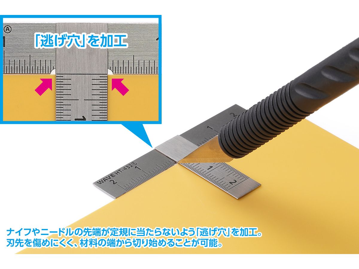 ・切断作業の際、ナイフやニードルの先端が定規に当たらないよう、交差部分に「逃げ穴」を加工。