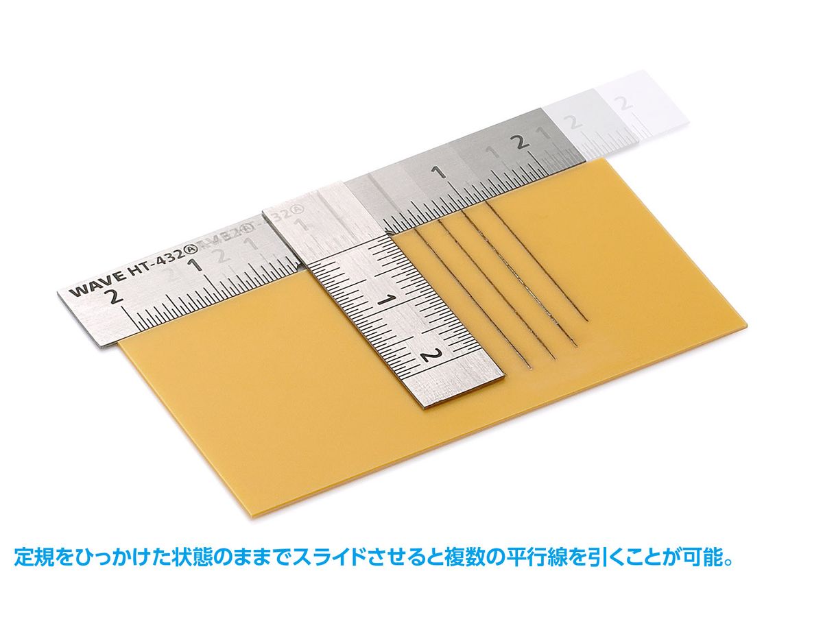・プラスチック板の切り出しの補助や、オリジナルパーツ作成時の計測作業などに便利なT定規です。