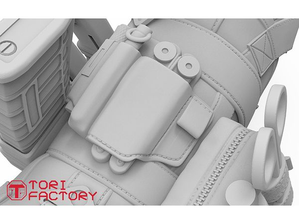 胴には多数のポケットの付いたハーネスを着け、左側にはアサルトライフルと拳銃の弾倉、右側にはハサミや注射器など救急装備などを装着しています。